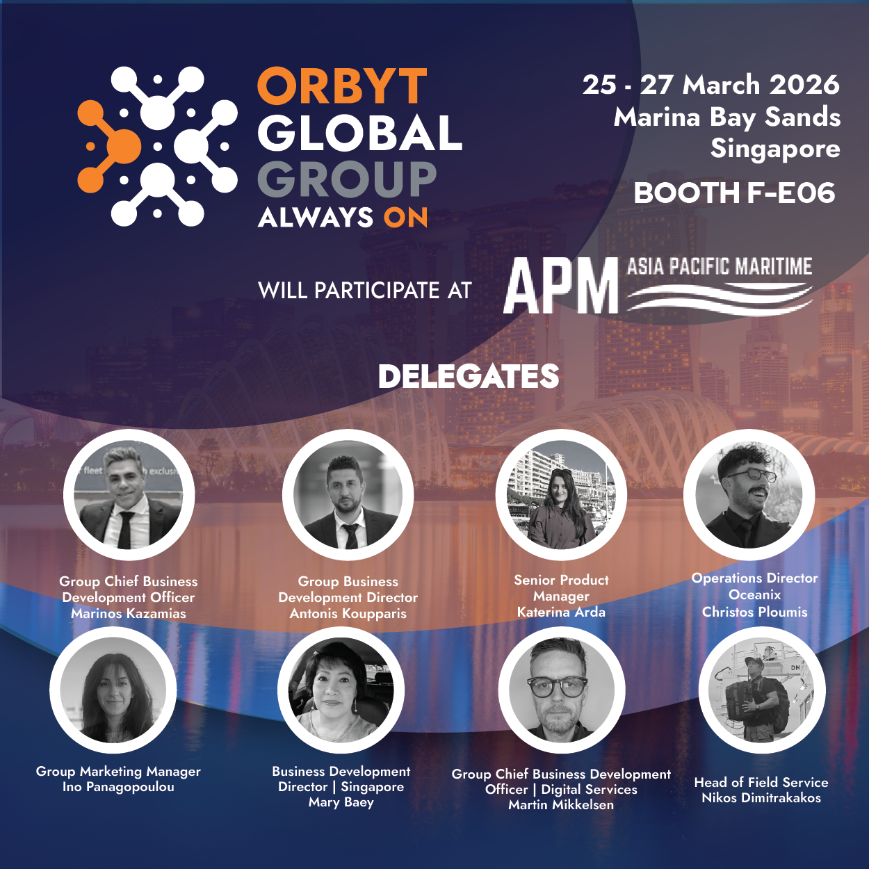 Orbyt Global Group is pleased to announce its participation in the Asia Pacific Maritime (APM) 2026, one of the leading maritime exhibitions in the region, taking place in Singapore. The event will be held from 25 to 27 March 2026 at Marina Bay Sands, bringing together key stakeholders, innovators, and decision-makers from across the global maritime industry. Orbyt Global Group will be welcoming visitors at Stand F-E06, where attendees can meet our global team and learn more about how our technologies are supporting the next generation of maritime operations. Our presence at APM 2026 reflects our ongoing commitment to innovation, collaboration, and the advancement of digital solutions within the maritime sector.